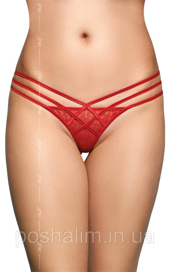 Еротичні трусики-стрінги червоного кольору. Виконані з напівпрозорого мережива в ніжний узор в поєднанні з щільними атласними смужками, що перехрещуються.